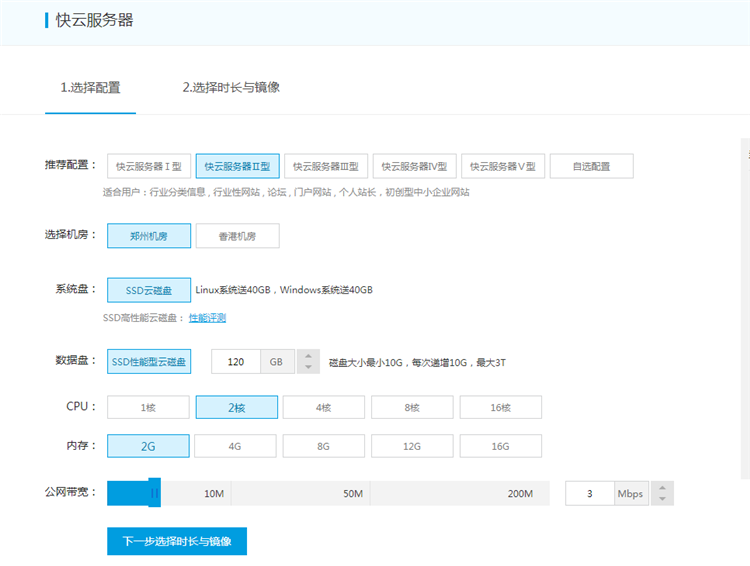 2)選擇配置類型,機(jī)房位置,數(shù)據(jù)盤容量,帶寬后點擊下一步選擇時長與鏡像