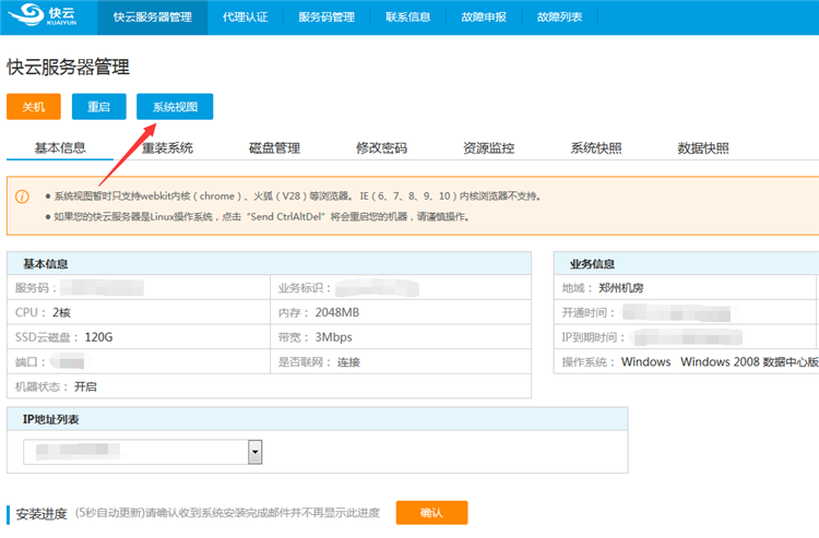 5)在快云服務(wù)器管理頁面點擊系統(tǒng)視圖