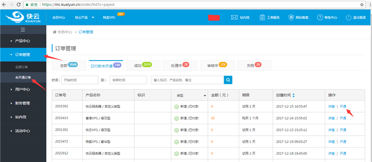 1)購買成功后,可在管理中心--訂單管理--未開通的訂單查看購買還沒有開通的業(yè)務(wù)。