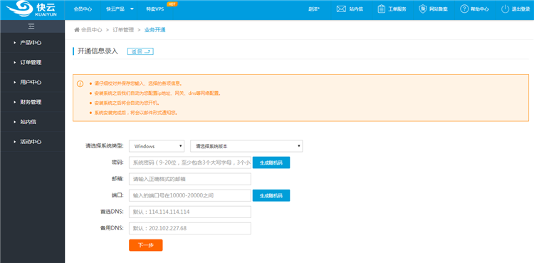 6)在快云服務(wù)器管理平臺,等待系統(tǒng)安裝完成,即可完成開通并登陸服務(wù)器