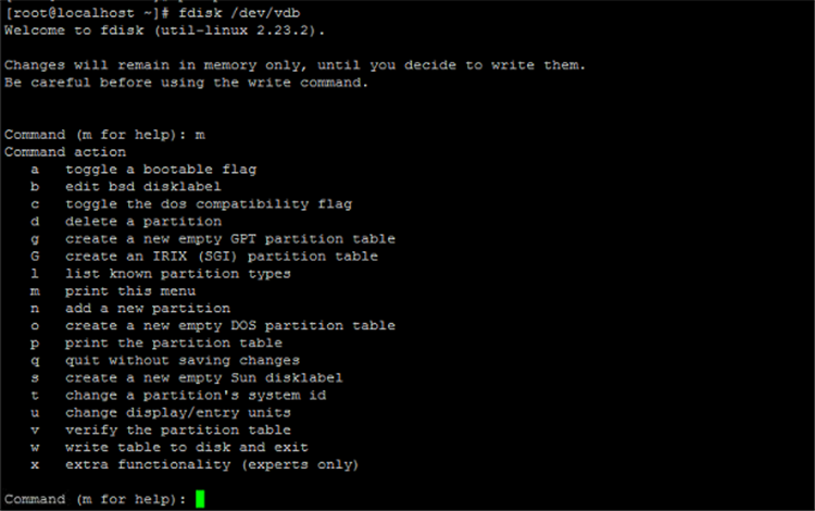 2)磁盤分區(qū),以fdisk分區(qū)工具為例,只分一個區(qū),命令:fdisk /dev/vdb