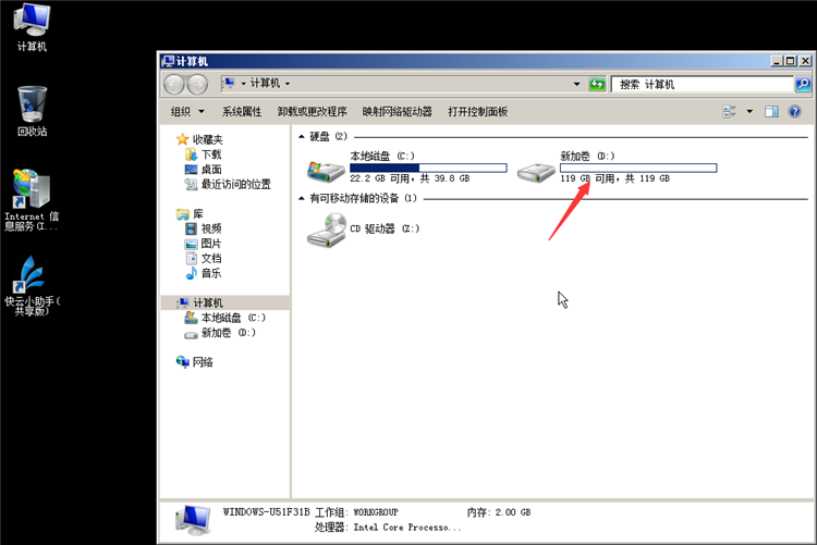 4)打開計算機(jī)查看,出現(xiàn)新加卷說明已經(jīng)成功