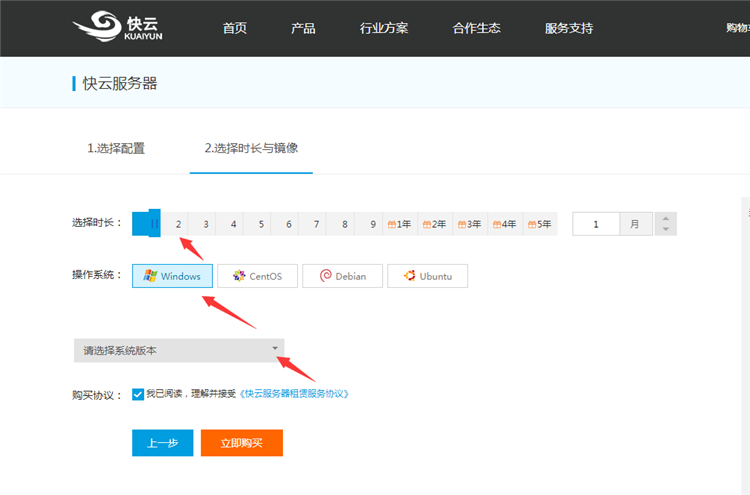 3)選擇時長和系統(tǒng)的版本,點擊立即購買。