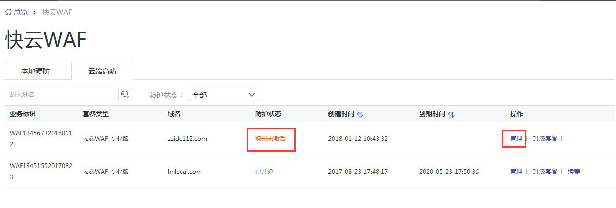 添加成功之后,此時狀態(tài)是購買未激活.點(diǎn)擊管理進(jìn)行激活操作