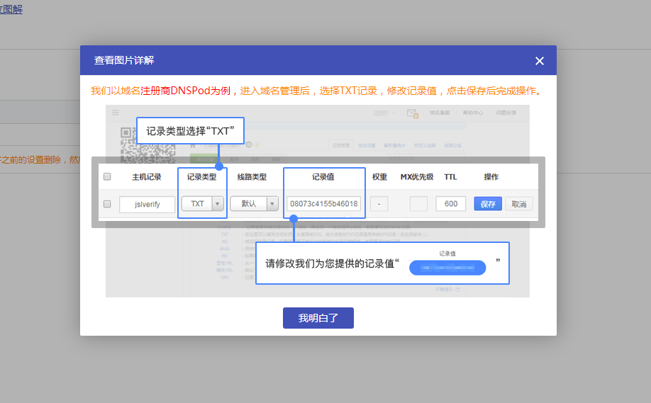 進(jìn)入域名注冊商域名管理頁,然后記錄類型選擇TXT類型.記錄值改為下圖所示的記錄值.改完之后大概幾分鐘之后會生效,點(diǎn)擊下圖立即激活按鈕