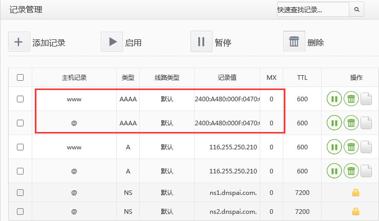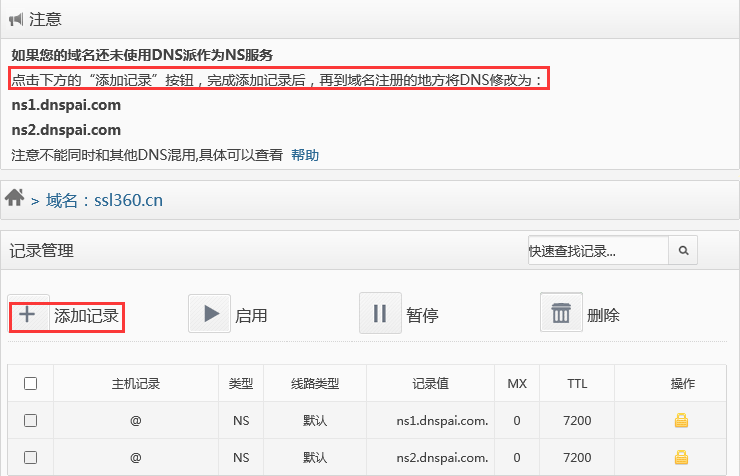 3、點(diǎn)擊域名進(jìn)入域名記錄管理,為保證更換DNS后各項(xiàng)解析記錄有效,可通過(guò)“添加記錄”按鈕將原有解析平臺(tái)的記錄(A記錄、MX記錄等)在DNSPai平臺(tái)添加一遍。