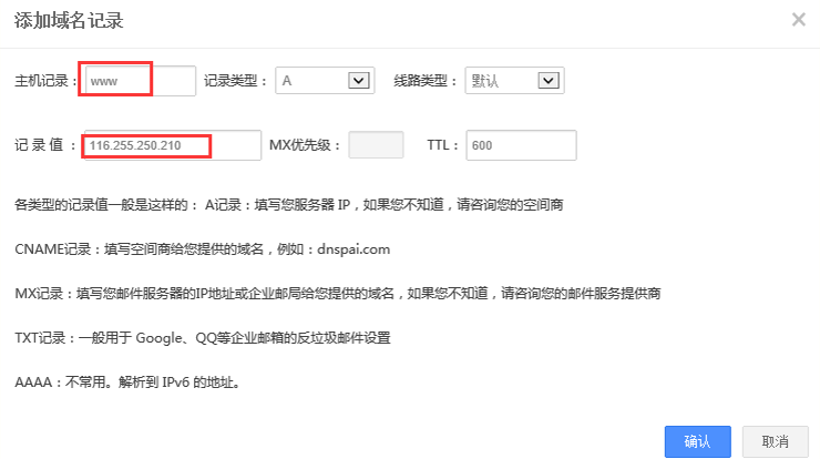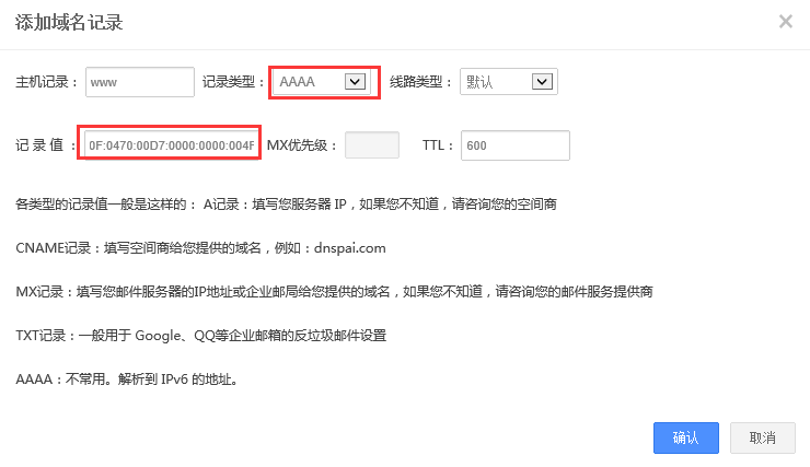 4、添加AAAA類型的IPv6解析,記錄值填寫業(yè)務(wù)分配到的IPv6地址,點(diǎn)擊保存。
